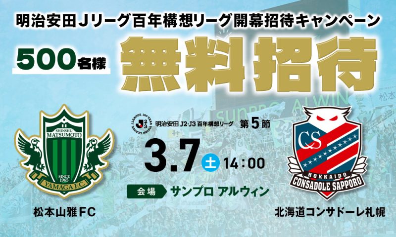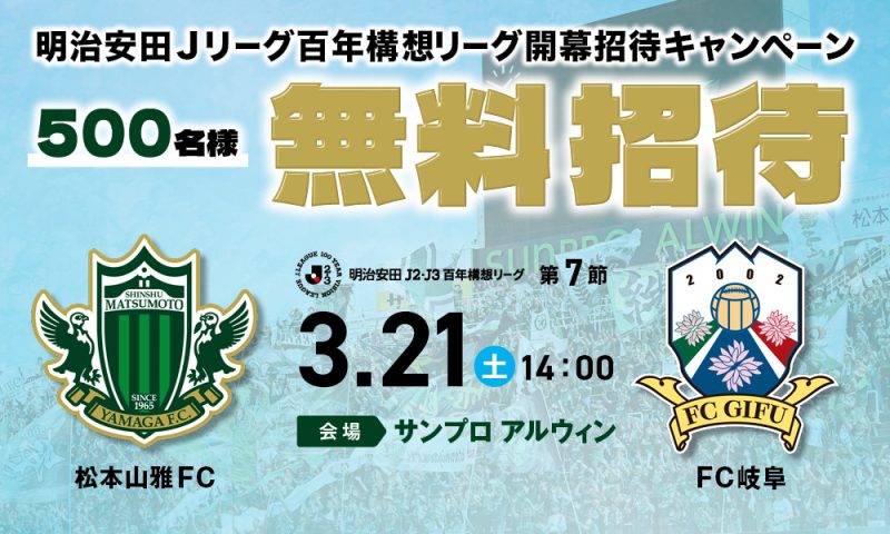 松本山雅FCでは、3月7日(土)北海道コンサドーレ札幌戦と3月21日(土)FC岐阜戦を対象に、抽選で合計ホーム自由席1,000名様を無料ご招待いたします。