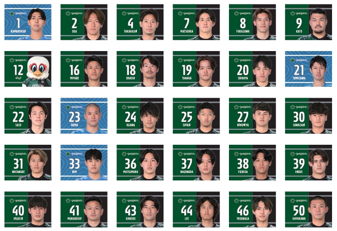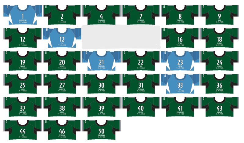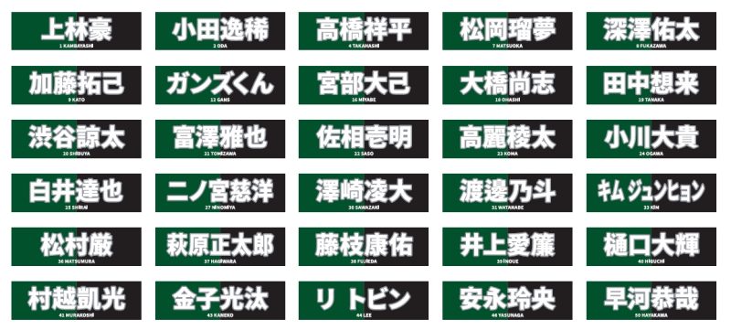 No.2小田選手/No.9加藤選手/No.16宮部選手/No.19田中選手/No.20渋谷選手/No.24小川選手/No.30澤崎選手/No.36松村選手/No.37萩原選手/No.40樋口選手/No.41村越選手/No.46安永選手/No.12ガンズくん