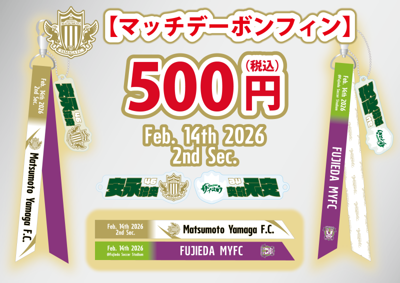2月14日(土)「明治安田J2・J3リーグ百年構想リーグ 第2節 藤枝MYFC vs 松本山雅FC」では、試合会場の藤枝総合運動公園サッカー場にて、松本山雅FCオフィシャルグッズの出張販売を行うことが決定いたしましたので、下記の通りお知らせいたします。