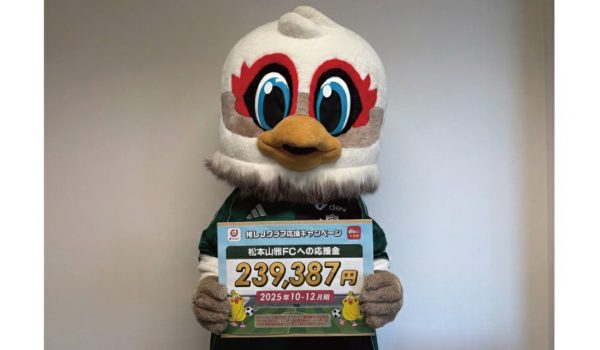 今回はドコモ様より、2025年10月30日から12月31日までの期間中にキャンペーン参加者のdポイント獲得数の5%相当金額にあたる239,387円を松本山雅FCへ応援金として頂戴し、クラブを代表してオフィシャルマスコットのガンズくんが目録を贈呈いただきました。