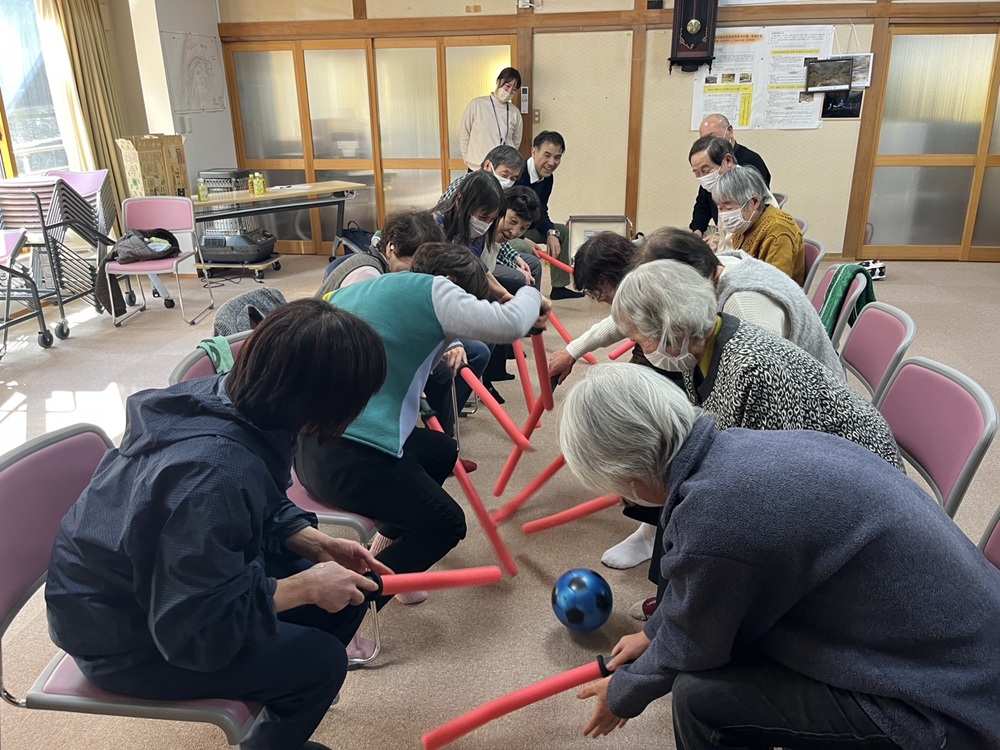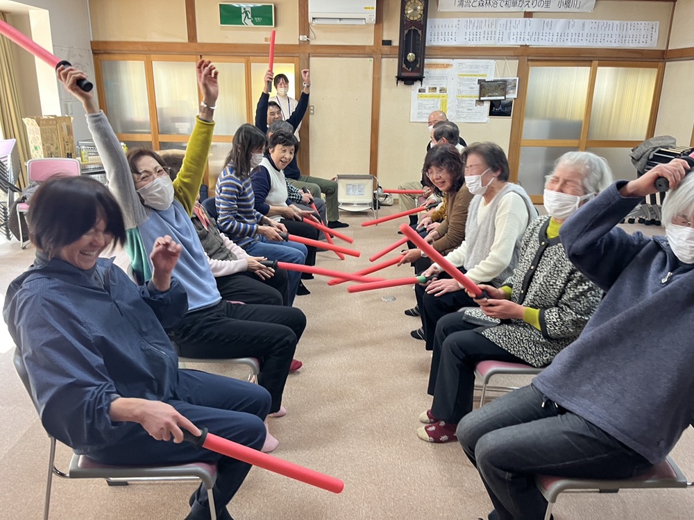 今回は辰野町小横川地区にお住いの方々にご参加いただき、全身を使った脳トレやタオルマフラーなどを使いながら楽しく身体を動かしました。