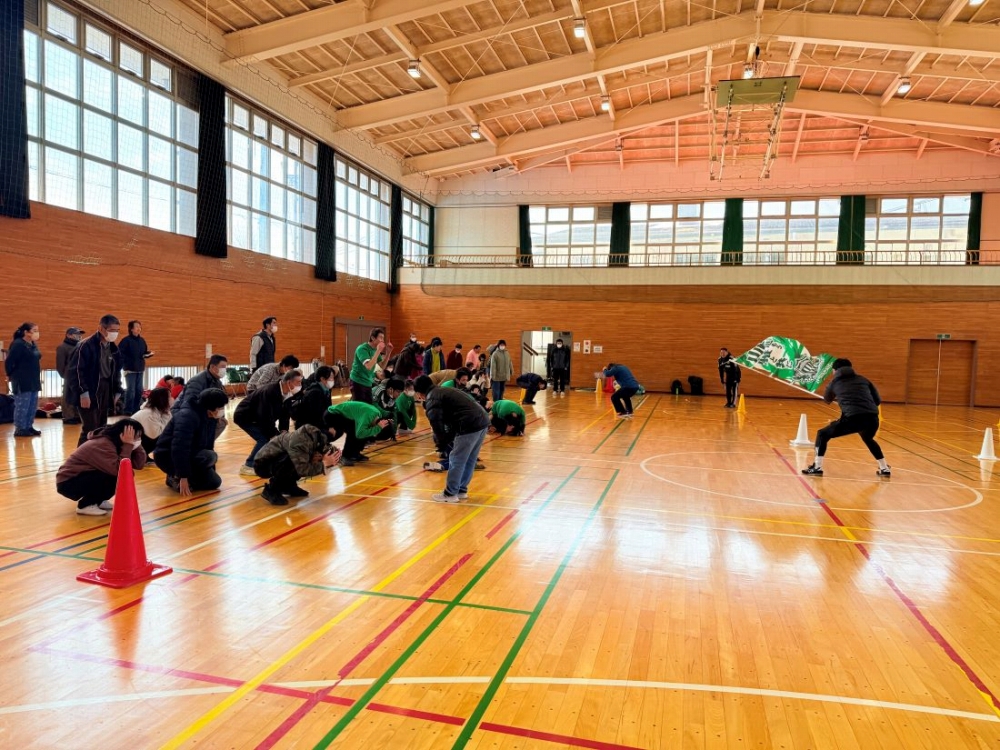 松本山雅FCレディース監督の小林陽介が中心となり、のぼりを使った忍者ゲームやだるまさんがころんだ、ボールを使ったミニゲームなどを楽しみました。