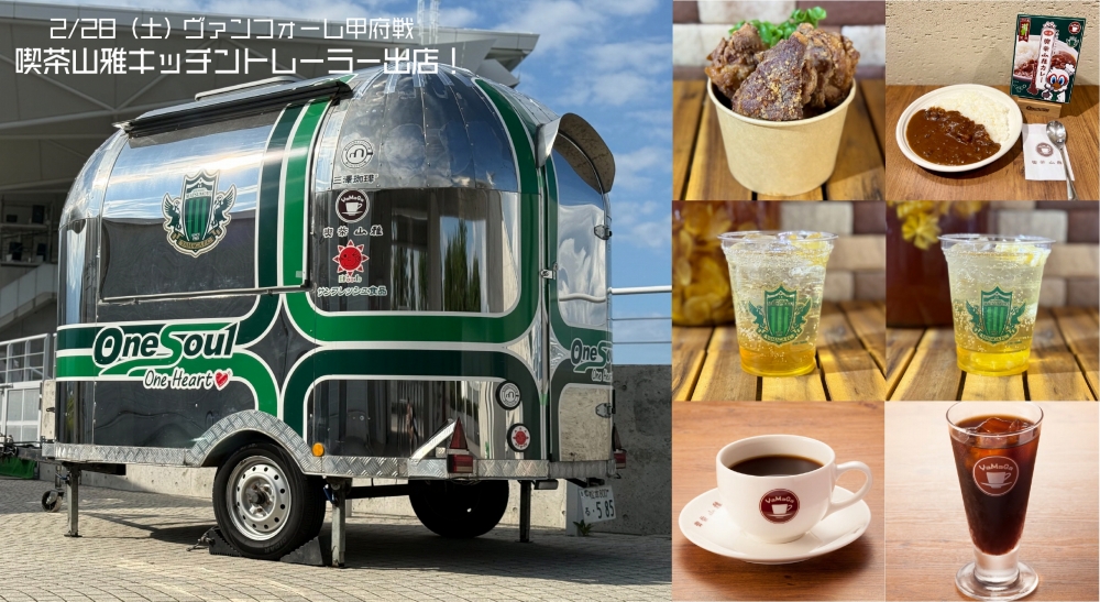 このたび、2月28日(土)にJIT リサイクルインク スタジアムで開催されるヴァンフォーレ甲府戦にて、喫茶山雅キッチントレーラーの出店が決定しましたのでお知らせいたします。