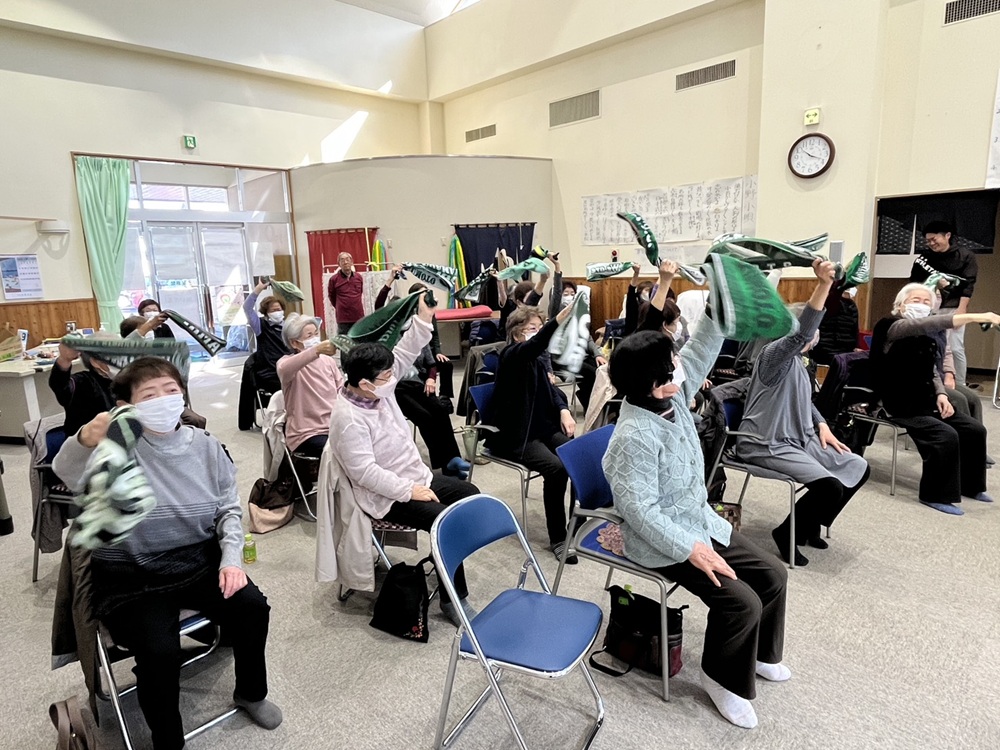 今回は辰野町小野地区にお住いの方々にご参加いただき、全身を使った脳トレやタオルマフラーなどを使いながら楽しく身体を動かしました。