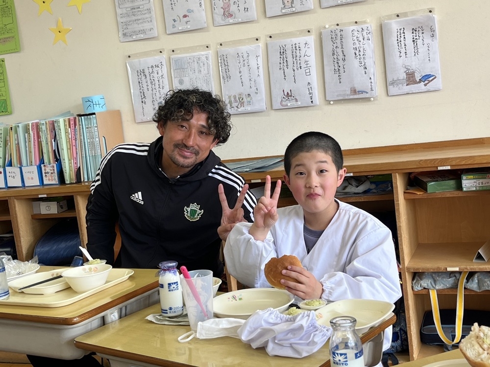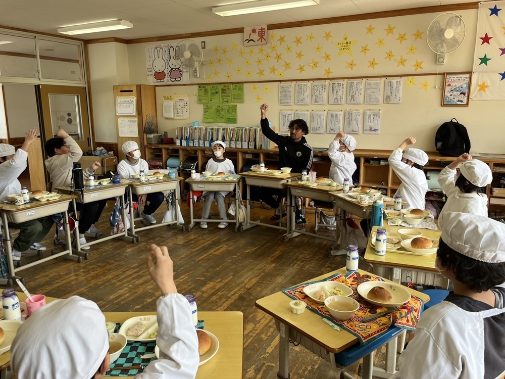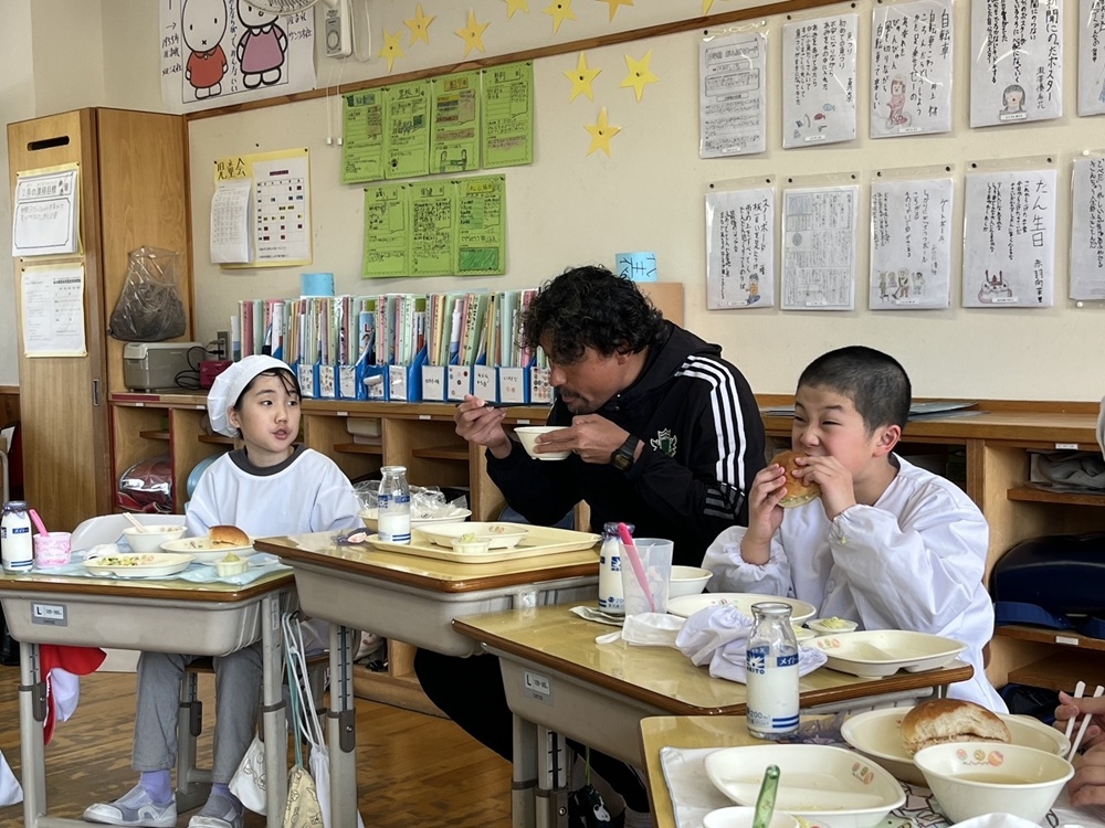 今回メニュー考案をしてくれた生徒とアカデミーロールモデルコーチ 橋内優也が四賀小学校4年生と一緒に給食を食べました。