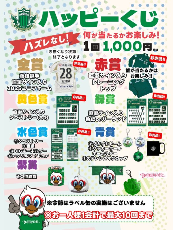 金賞は藤枝康佑選手の実着用直筆サイン入り2025ユニフォーム2nd、赤賞は選手実着用直筆サイン入りトレーニングウェアの豪華2本!!