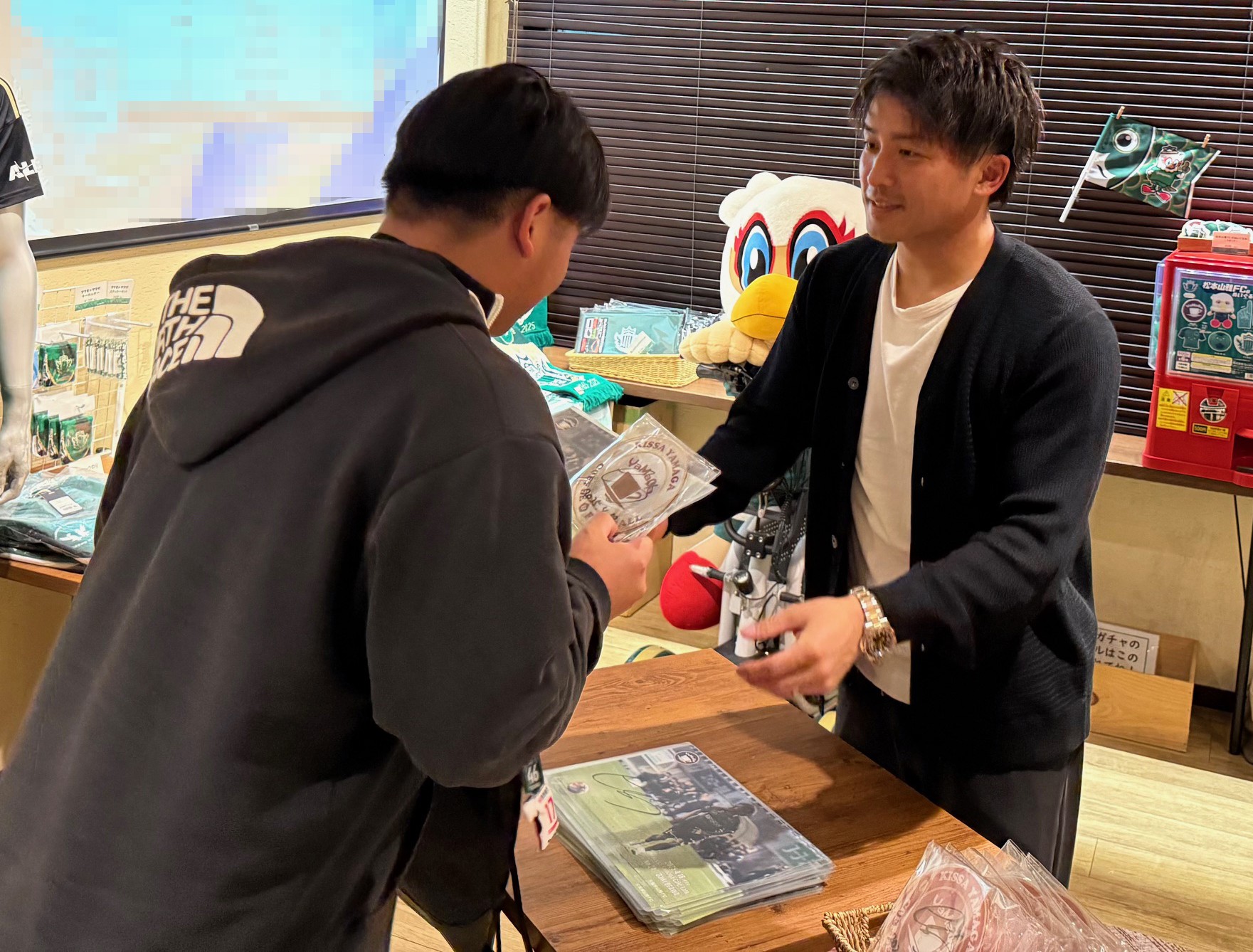 カフェトークは、片山真人クラブプロモーション担当をMCに、選手の生の声や本音を聞くことができ、選手をより身近に感じられる喫茶山雅ならではのイベントです。