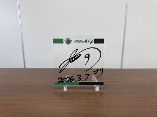「熱プレ!」とは「熱いプレー×アクリルプレート」を掛け合わせた企画名で、ホームゲームで本日のMVP(Man Of tha Match)に選ばれた選手が、「熱プレ!」に直筆でサインと試合日を入れた商品となります。