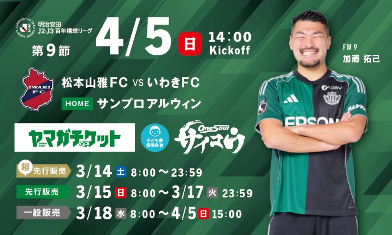 4月5日(日)に開催いたします「明治安田J2・J3百年構想リーグ 第9節 いわきFC戦(14:00キックオフ/サンプロ アルウィン)」の観戦チケット販売およびシーズンパス・招待券でのご観戦について、お知らせいたします。
