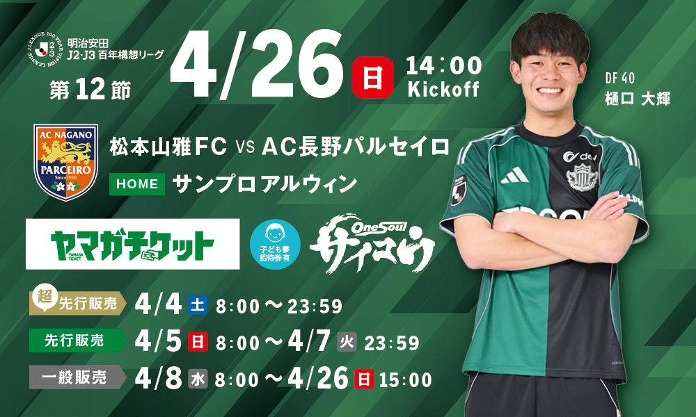 4月26日(日)に開催いたします「明治安田J2・J3百年構想リーグ 第12節 AC長野パルセイロ戦(14:00キックオフ/サンプロ アルウィン)」の観戦チケット販売およびシーズンパス・招待券でのご観戦について、お知らせいたします。