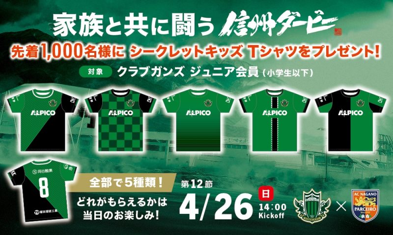 4/26(日)信州ダービー 【クラブガンズ ジュニア会員限定(小学生以下) 】来場者先着1,000名様にシークレットキッズTシャツをプレゼント
