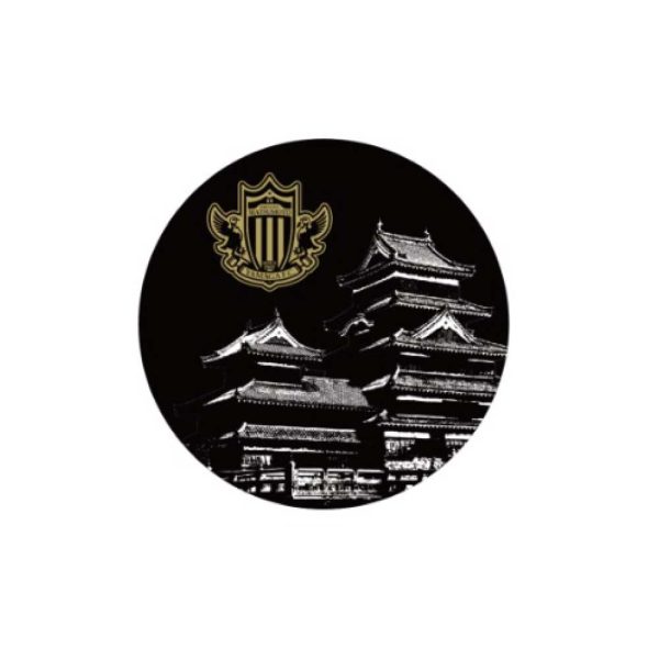 メタル調の質感が特徴の缶バッジ。松本城デザインが映えるデザインに仕上がっております。