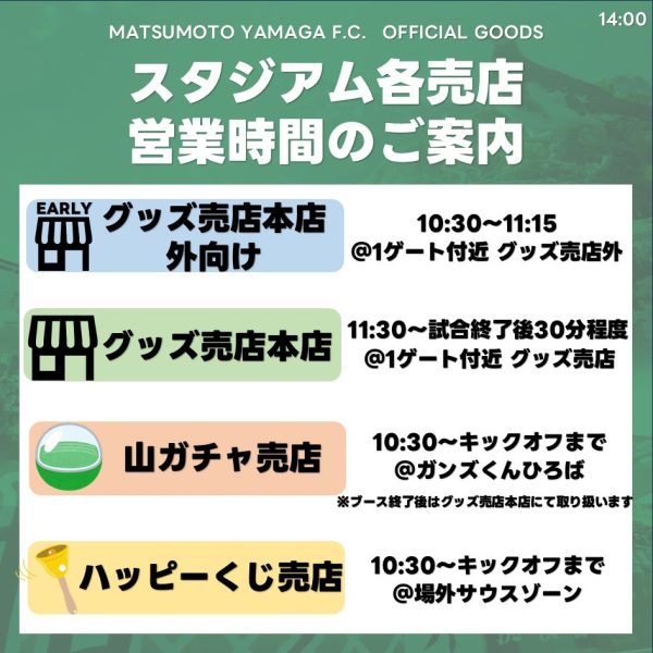 | 松本山雅FCオンラインショップ <4/26(日)10:00~> | × | △ ※在庫が残った場合、 後日取り扱い | △ ※在庫が残った場合、 後日取り扱い | × |