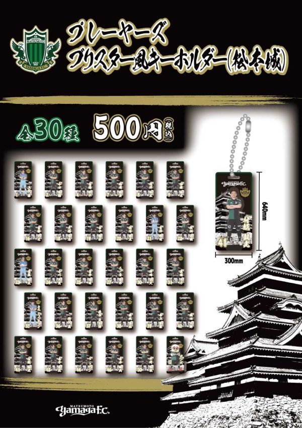松本城売店で4月に販売し、即日完売したTシャツの別デザインバージョンをはじめ、選手ともコラボした山ガチャ「プレーヤーズブリスター風キーホルダー(松本城)」も登場!