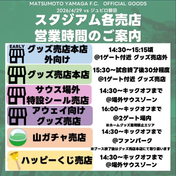 ぜひ「グッズ売店本店」、サウスゾーン場外「特設売店」「ハッピーくじ」ブース、ファンパーク「山ガチャ」ブース、にお立ち寄りください!