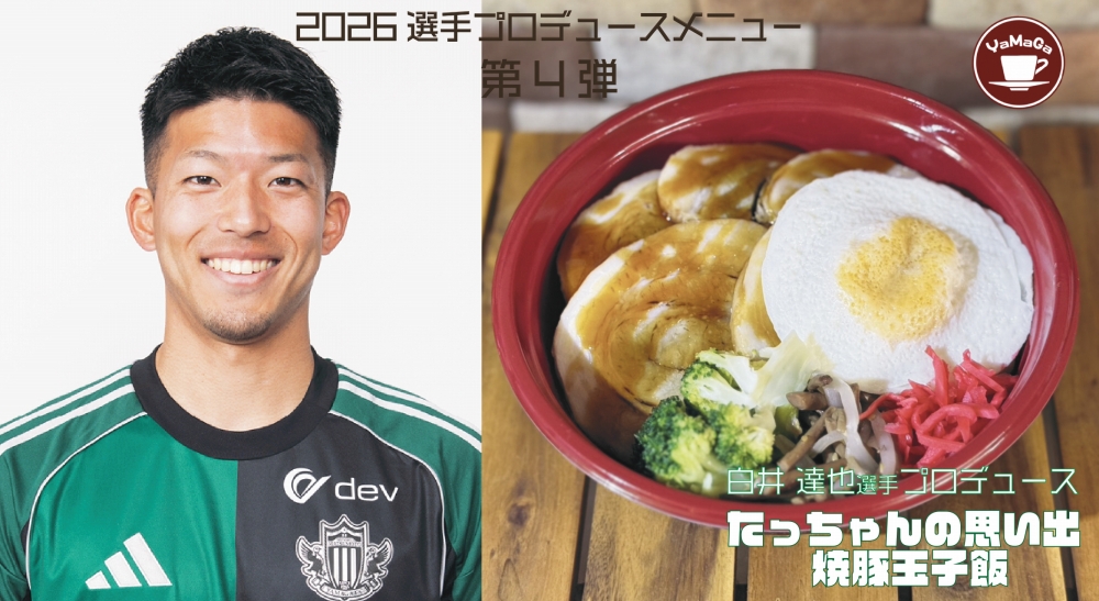 喫茶山雅「2026選手プロデュースメニュー」第4弾として、白井 達也選手の「たっちゃんの思い出 焼豚玉子飯」を、4月26日(日)AC長野パルセイロ戦限定で販売することが決定しましたので、お知らせいたします。