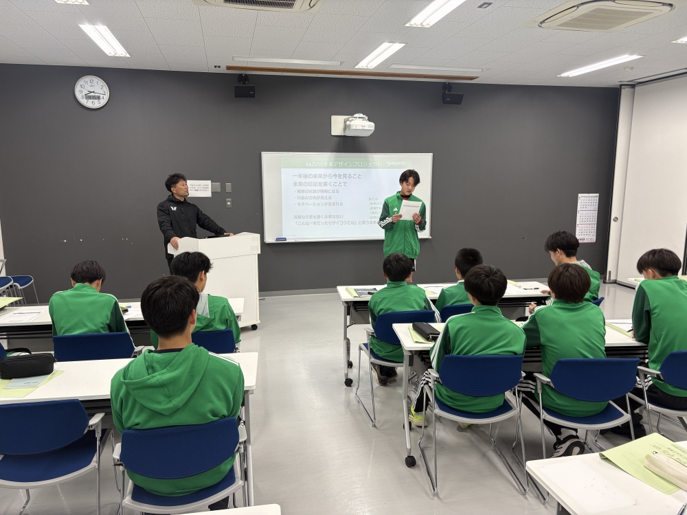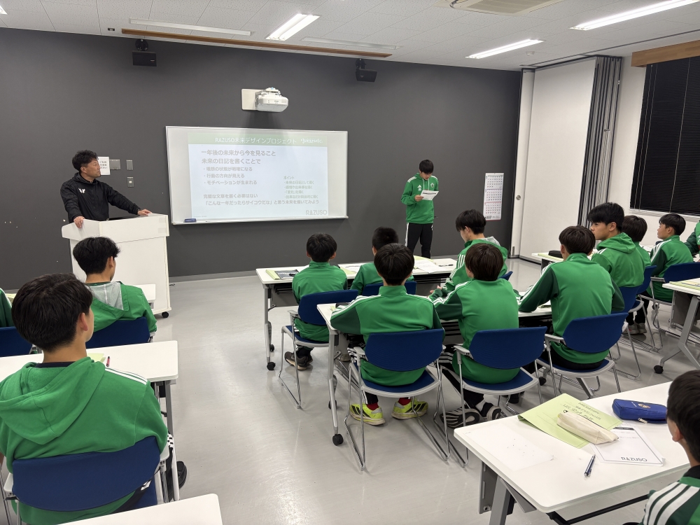 「RAZUSO未来デザインプロジェクト」は、ユースアカデミーの選手たちが、さまざまな分野で活躍されている方々から、夢や目標を実現するまでの経験談を伺い、自身の将来について考える機会をつくることを目的とした取り組みです。