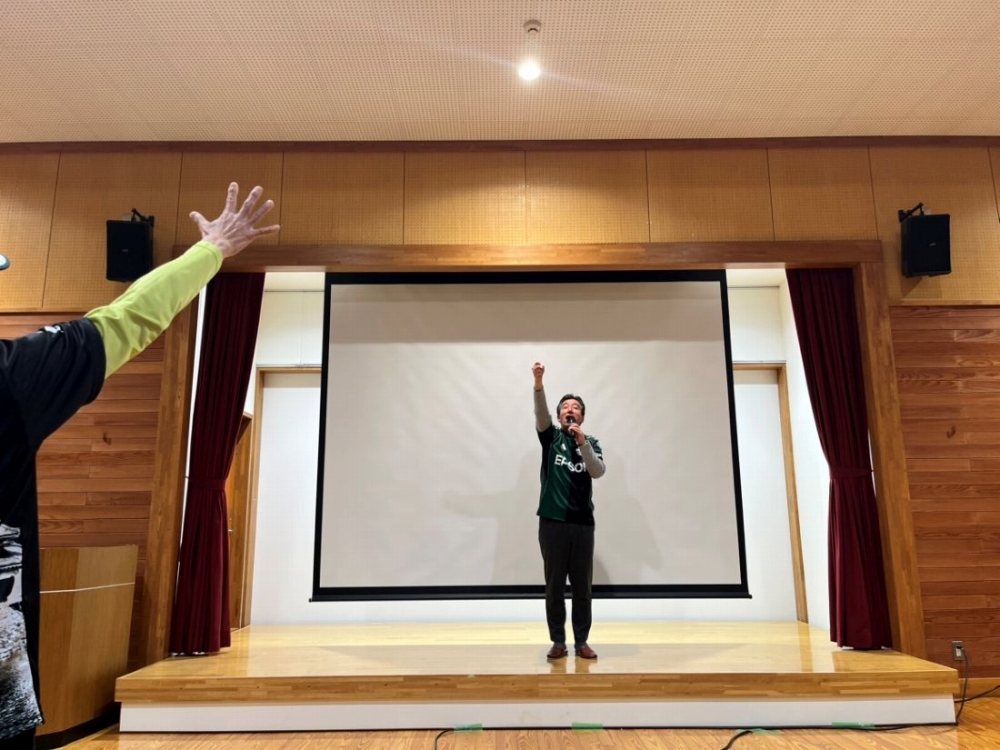 石崎監督と塩尻市出身の樋口選手から来場者へのメッセージ動画もあり、応援への熱量を高めました。