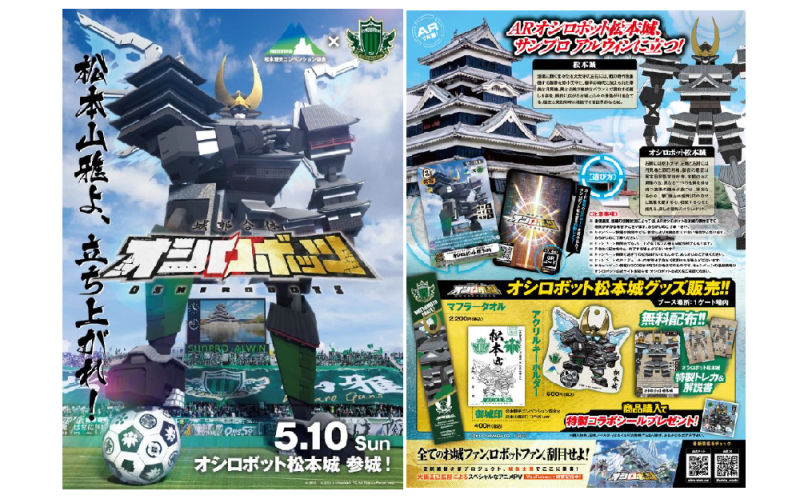 このたび松本山雅FCでは、松本観光コンベンション協会と連携し、5月10日(日)明治安田J2・J3百年構想リーグ「松本山雅FC vs 藤枝MYFC」の試合会場にて『城郭合体オシロボッツ』とコラボ企画を実施することとなりましたのでお知らせいたします。
