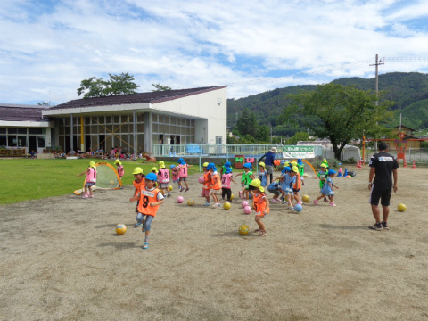 9月5日(月)に北安曇郡会染保育園の年長さん28名を対象に巡回指導を行い、松本山雅FCより小松コーチと小林コーチが参加しました。