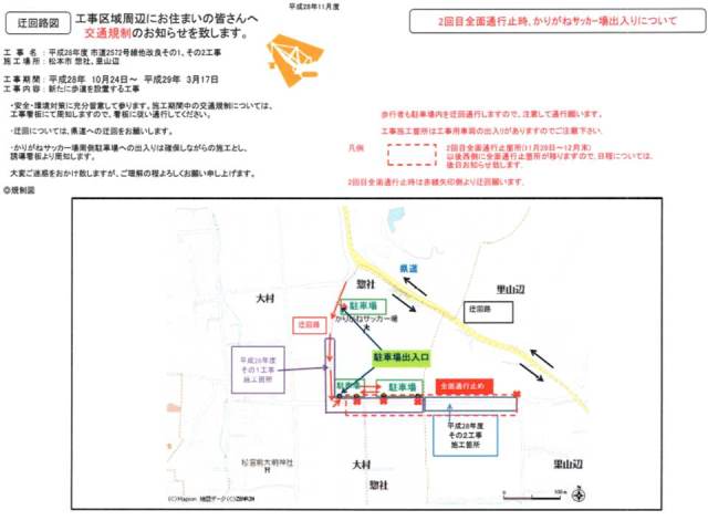 日頃、松本山雅FCの練習で使用しております、かりがねサッカー場の駐車場前道路につきまして、平成28年10月24日(月)~平成29年3月17日(金)(予定)まで下記の通り交通規制となります。