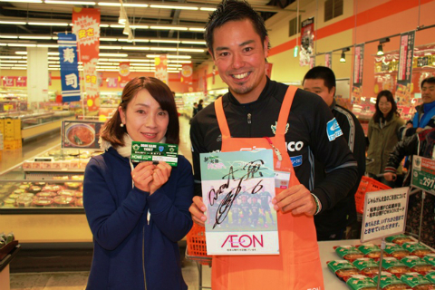 当日は茅野店・山形店・松本村井店の各店舗で、片山ホームタウン担当が1時間店長に就任し、「松本山雅FC応援弁当(厚切りロースカツ玉重)」または「松本山雅WAON」をお買い上げの方を対象に、サインや写真撮影を行い、またじゃんけん大会で片山1時間店長に勝った先着各20名様に「11/20横浜FC戦のチケット(ホーム自由席)」をプレゼントしました。