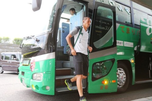 いろんな表情でスタジアム入りやな。