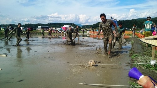 田んぼがコートになってる、もう泥まみれに絶対なるこのコンデションです。