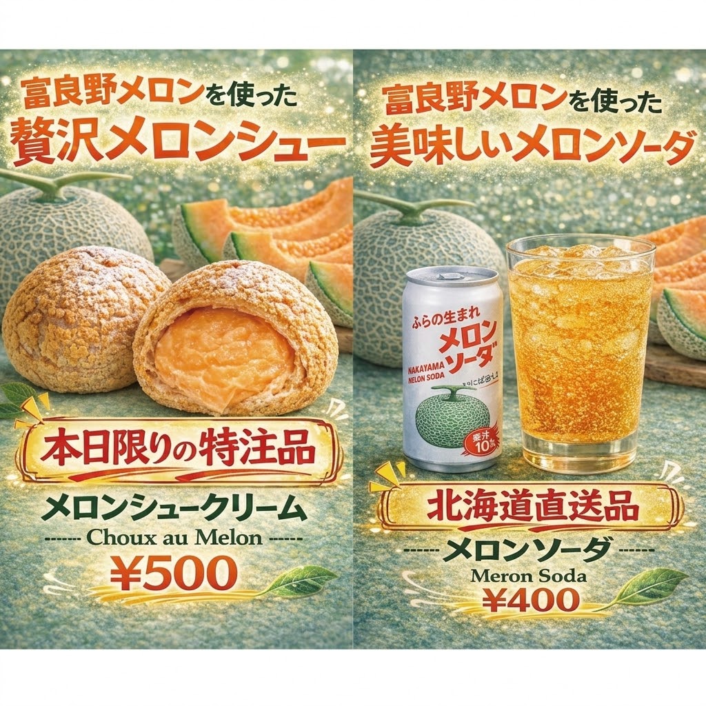 | おすすめ | メロンシュークリーム 500円 メロンソーダ 400円 |