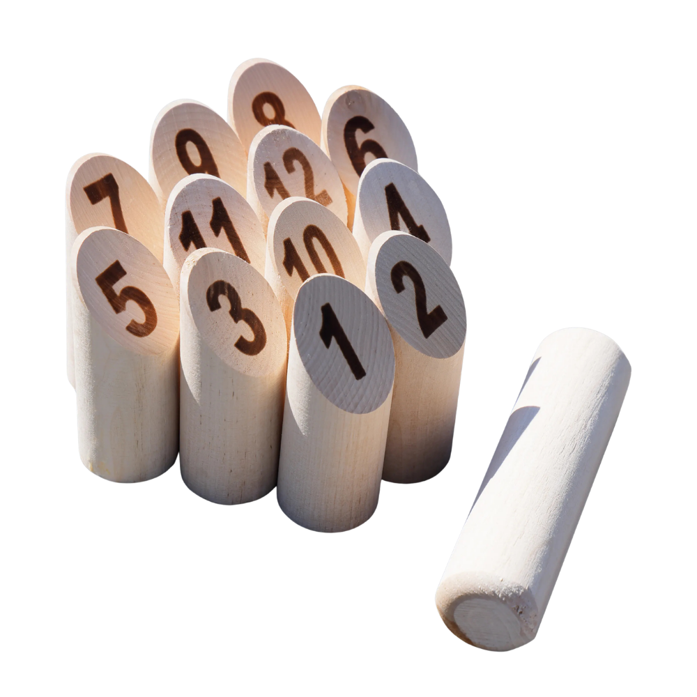 木製の棒を投げて、数字の書かれたピンを倒しちょうど50点を目指そう!