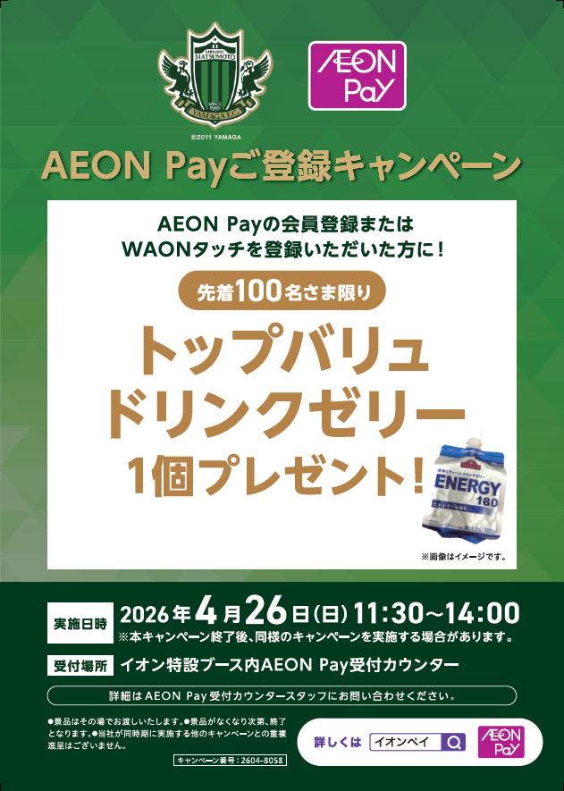 | 実施時間 | 受付:11:30 ~ 14:00 お渡し:試合終了後 |