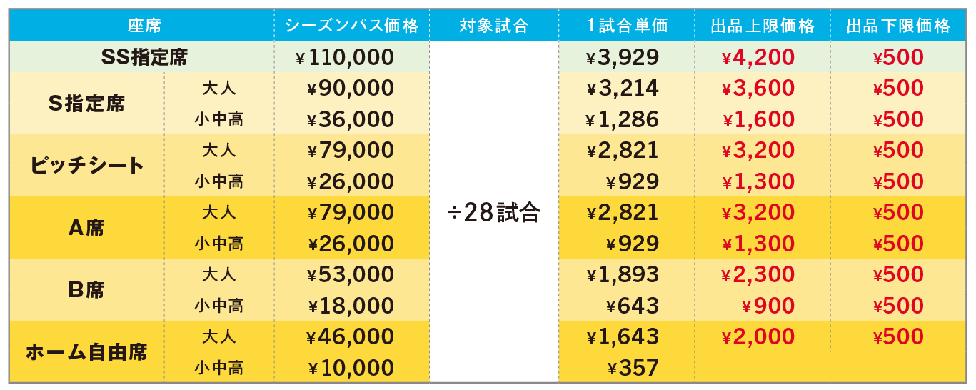 - 出品価格はシーズンパス1試合単価を上回らない様に設定しております。