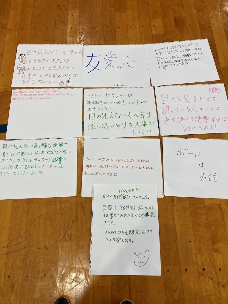 1年生を10グループに分けて準備体操、ボール運び、ドリブル、パスなどのワークにアイマスクをして取り組む役とガイド役を交代で体験していただきました。