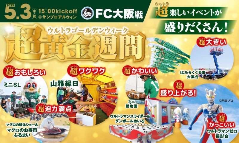 5/3(水・祝)FC大阪戦では、サンプロアルウィンで超(ウルトラ)楽しい思い出をたくさん作って、最高なゴールデンウィークにしていただけたらと考え、「超黄金週間(ウルトラゴールデンウィーク)」と題して、お子様はもちろんのこと大人の方も楽しめる、超(ウルトラ)面白いイベントをたくさん企画しております。